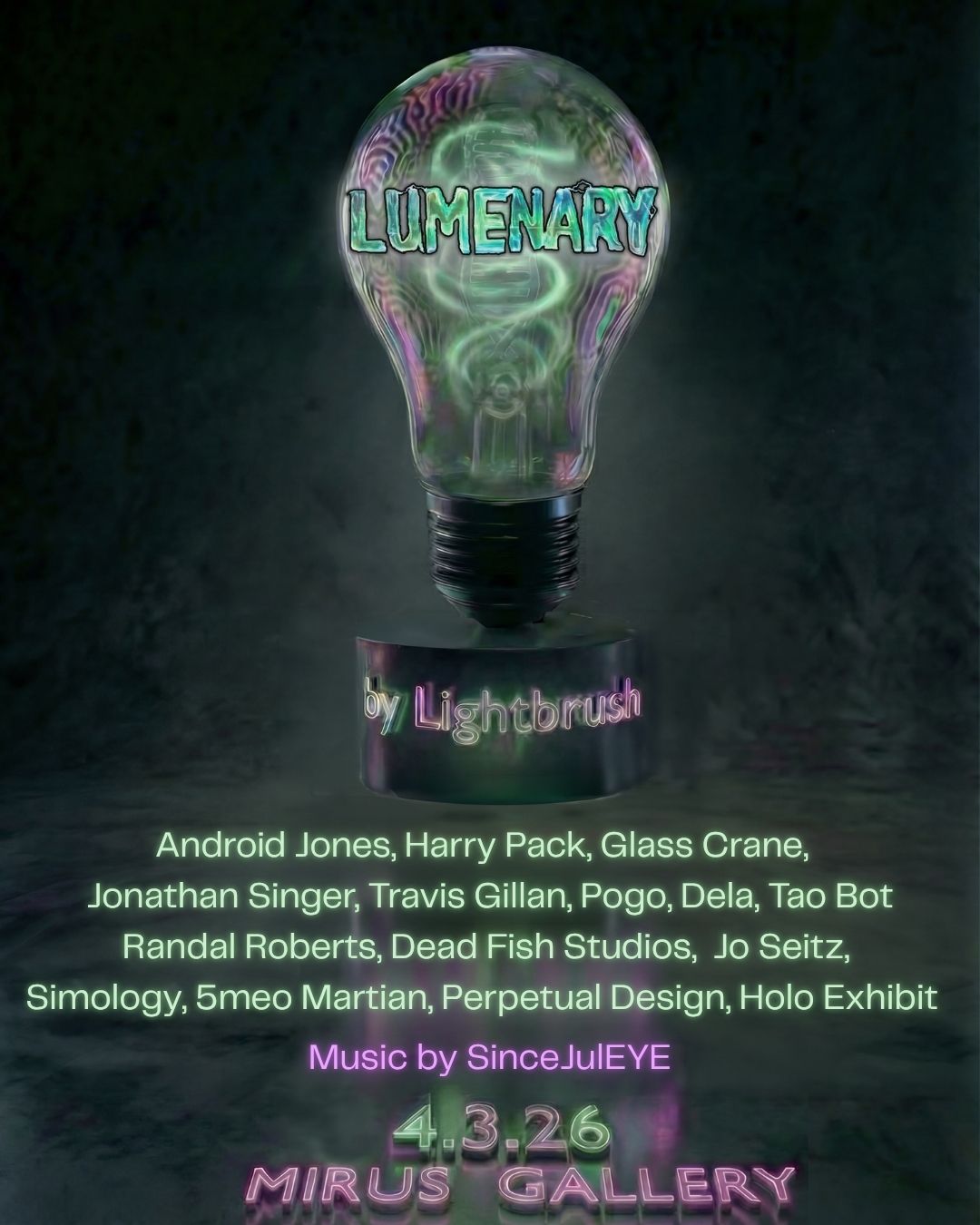 About the Exhibit: Through projection mapping, augmented reality, holographic displays, and AI-driven experiences, we invite viewers to step beyond passive observation into active participation. This exhibition showcases work by Lightbrush alongside a dozen artist collaborators shaping the future of interactive and immersive art. From visionary painting to 3D holographic displays and consciousness-expanding digital experiences, LUMENARY celebrates the evolving relationship between human creativity and technological possibility. Light becomes a medium for exploring consciousness, perception, and the spaces between physical and digital worlds.