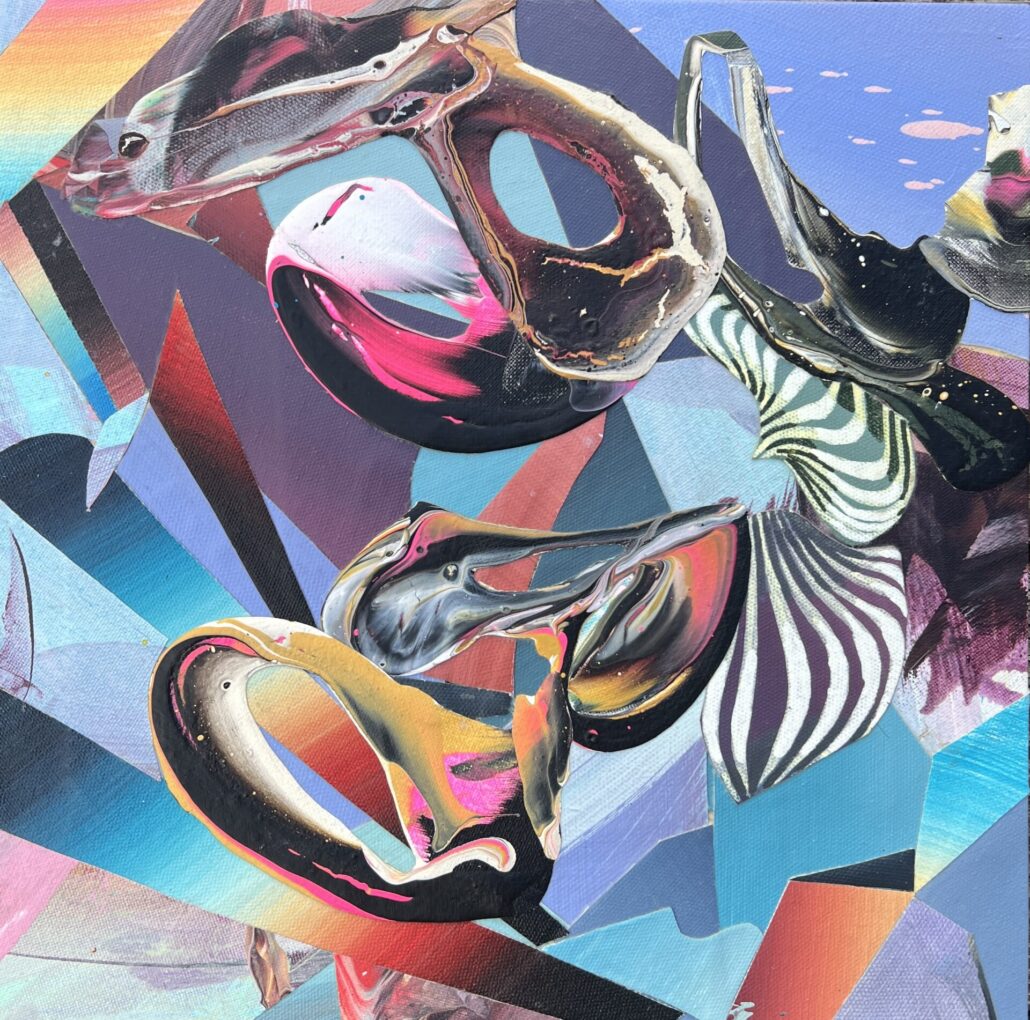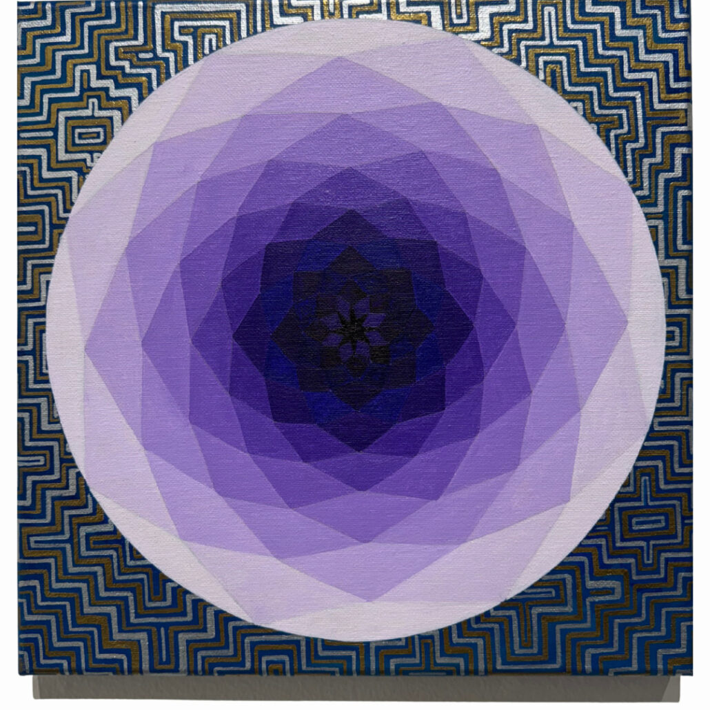 Travis Gillan’s work is rich with layered symbolism, each piece unfolding like a meditation—revealing deeper insights into the nature of human consciousness and glimpses of what may lie beyond the threshold of a new dawn. The conceptual rigor of the work is grounded in a meticulously balanced synthesis of form and a refined, opulent color harmony. Each composition reflects a deliberate orchestration of chromatic nuance and structural precision, revealing a thoughtful interplay between surface and depth. Flat, saturated shapes intersect with volumetric forms, disrupting conventional spatial hierarchies and generating a visual tension that both collapses and expands the perceived dimensional field within a cohesive pictorial framework.