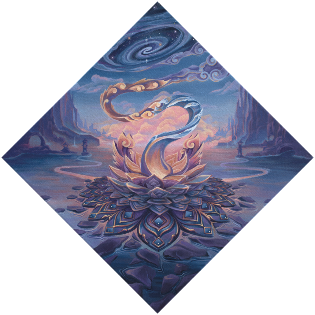 Revelator is a collection of paintings that unveils a consciousness-altering symbol intended to reconcile the schism in the collective psyche. This emblem—a beacon of inner transformation—tears away the illusion of separation, illuminating the unity that underlies the many. It calls us beyond the dualistic subject/object paradigm of the human mind, urging a shift toward inner coherence. Reflecting the reciprocal nature of reality, the symbol reveals how our inner world continuously shapes the outer, blurring the boundary between the higher forces that rise from within and those that descend from above.