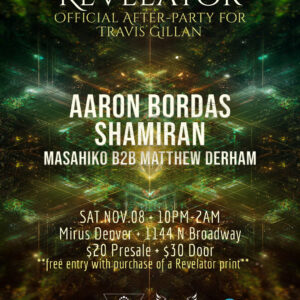 Revelator Afterparty in the Loft Soulestial & Thunderbird Music Present REVELATOR: The official After-Party for Travis Gillan’s ... 08 - 09 Nov 9:30 pm - 2:00 am Mirus Art Bar Denver1144 Broadway, Denver, CO 80203